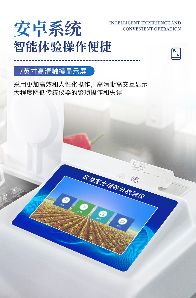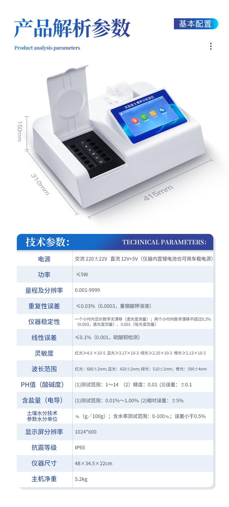 产品描述:仪器用途:(新开发,农资经销商、农技体系普及型)(新一代智能型,内置测土配方施肥功能,图谱诊断,二维码打印,数据上传,及测试用到的所有配件,保证用户只需提供纯净水即可完成氮磷钾有机质pH含盐量的准确测定!)产品简介:配套齐全:该仪器无需用户自配附件,相当于一个小型实验室。适于农业服务部门或农资经销商、合【详情】