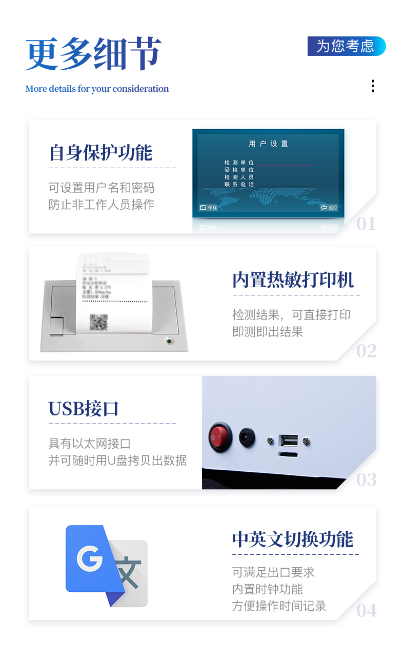 | 1、本仪器集各功能于一身,无需用户自配附件,可灵活流动检测。 | 2、安卓智能操作系统,主控芯片采用ARM Cortex-A7,RK3288/4核处理器,主频1.88Ghz,运转速度更快速,稳定性更强。 | 3、12个检测通道(固态化设计),一次性可快速检测6个样品,极大提升检测效率,降低检测成本。 | 4、检测过程中内置校准功能,智能恒流稳压,光强自动校准,确保检测准确度。 | 5、内置作物专家施肥系统,可对百余种全国农业经济作物、果树等的目标产量计算推荐施肥量,依据施肥配方科学指导农业生产。测土配方施肥结果可打印,打印内容包含:作物种类、肥料种类、目标产量、需求总量、建议施肥方案。 | 6、仪器标配wifi无线上传、4G联网传输、GPRS无线远传功能,快速上传数据。 | 7、仪器内置大容量内存,支持查看全部历史检测记录,以及传输所有检测数据。 | 8、配有智慧云农业平台,仪器连入无线网络后,可将检测数据可选择性或批量无线上传,方便用户进行长期数据管理和可视化分析。 | 9、仪器同时具有USB接口、以太网接口,并可随时用U盘拷贝出数据。 | 10、可用手机随时登录云平台在线移动查看历史数据 | 11、内置植物营养诊断标准图谱,根据各农作物营养缺失的图片,进行叶面对比,诊断丰缺。 | 12、4波长专业测试冷光源(红、蓝、绿、橙),光源波长稳定,长时间连续工作光源无温漂现象,寿命长达10万小时级别,重现性好,准确度高。 | 13、比色池部分采用标准1cm比色皿,无机械位移及磨损,光路测试定位**,有效屏蔽外光干扰,保证检测结果优于国标要求。 | 14、仪器系统内带有样品前处理操作视频,各种样品检测方法点击视频模块即可观看,检测人员无需自学说明书,指导教学方便快速,方便新手快速操作。 | 15、内置新一代高速热敏打印机(无需色带),打印内容包含:检测单位、检测人员、检测项目、通道号、吸光度、养分含量(mg/kg)、检测时间、以及二维码等信息 | 16、高灵敏7寸真彩触摸屏,采用更加**和人性化操作,高清晰高交互显示,大程度降低传统仪器的繁琐操作和失误。 | 17、内置时钟功能,方便操作时间记录,长期历史追溯。 | 18、可设置多账户账号密码登录,**UI交互界面,不同的用户可自由添加编辑检测信息,保存后可长期使用。 | 19、GPS功能:可在野外作业时记录经纬度地点,满足特殊用户需求。 | 20、内置低电压提示功能,可在检测时明确电量,避免测试数据偏移,同时具有断电保护功能,断电自动保存数据,防止数据丢失。 | 21、交直流两用供电方式,内置大容量充电锂电池,满电状态下可连续工作10余小时,同时可外接车载电源蓄电。 | 22、仪器具有中英文切换功能,可满足出口要求。 |