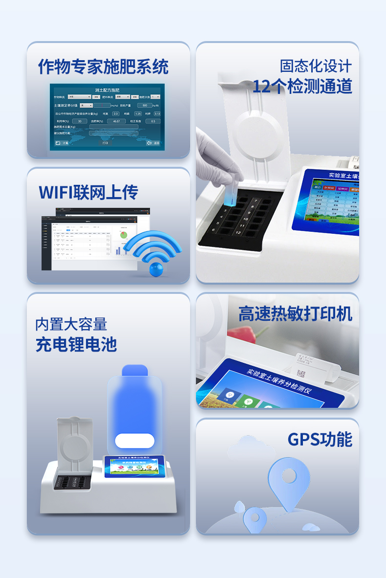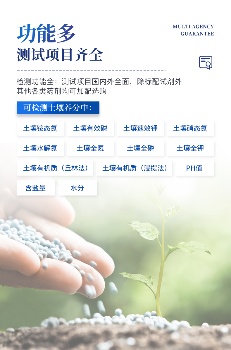| 配套齐全:该仪器无需用户自配附件,相当于一个小型实验室。适于农业服务部门或农资经销商、合作社、肥料厂商、大种植户测土施肥。 | 检测功能全:测试项目国内外全面,除标配试剂外,其他各类药剂均可加配选购。 | 操作简便、速度快捷,配套整套附件及成品药剂开瓶即用,无须配置。 |