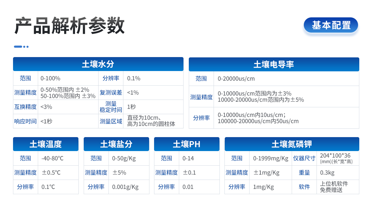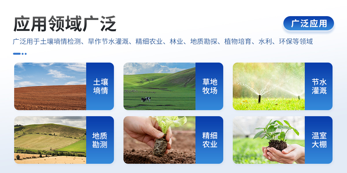 产品描述:产品简介:土壤水分温度盐分测定仪传感器采用一体化结构设计,可快速准确测量土壤中含水量、温度和电导率(盐分),可对多处样地、不同土壤深度的水分含量温度和盐分进行快速检测和长期连续监测。广泛应用于土壤墒情检测、旱作节水灌溉、精细农业、林业、地质勘探、植物培育、水利、环保等领域。功能介绍:仪器可加配【详情】