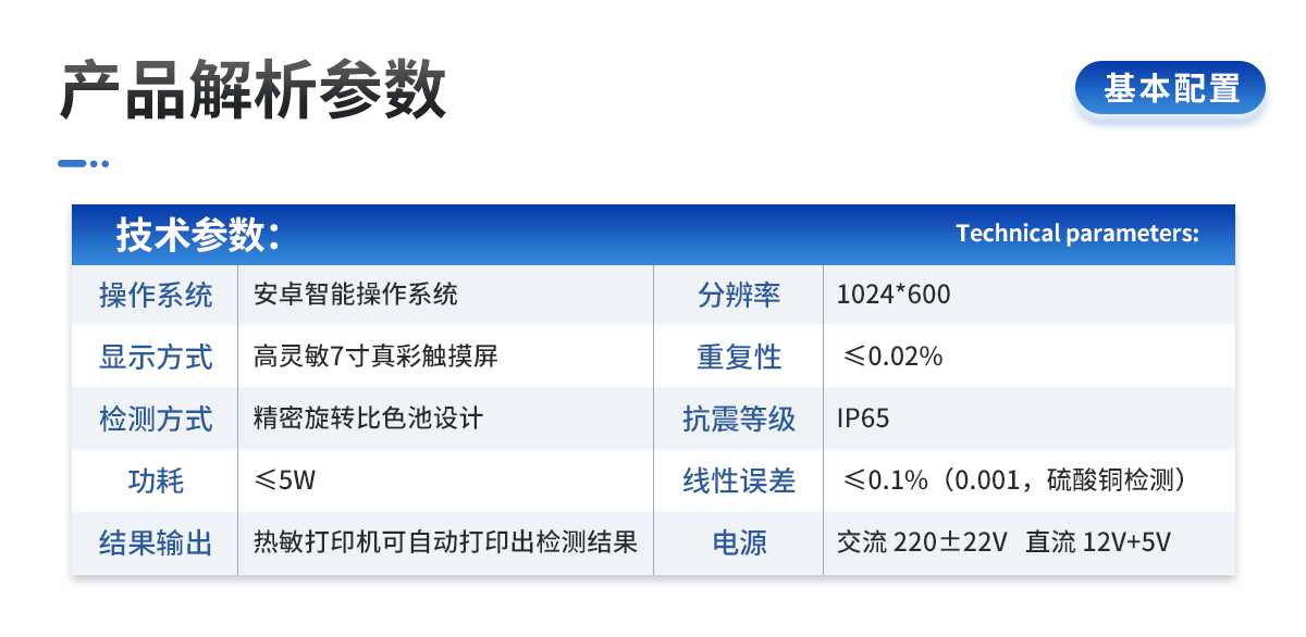 | 安卓智能操作系统Android 7.1版本,主控芯片采用ARM Cortex-A7,RK3288/4核处理器,主频1.88Ghz,运转速度更快速,稳定性更强。 | 可检测各种土壤、肥料、作物、食品、水质、环境等共200多个测试项目,一机多用,功能齐全。 | 测试速度更快!无需空白对照和标准校准,省却以往繁琐的操作步骤,一键式操作,直接读取数据,**率,低消耗。 | 12个旋转检测通道,一次性可快速检测12个样品,极大提升检测效率,降低检测成本。 | 采用高精度滤光片技术自主**分析方法(**号:ZL 2020 2 1763837.9),**认证。 | 具有自身保护功能,内置人脸识别摄像头可扫脸登录,也可设置用户名和密码,防止非工作人员操作查看实验数据。 | 检测过程中内置校准功能,智能恒流稳压,光强自动校准,确保检测准确度,取得中国计量科学研究院的《校准证书》 | 内置传感器航空接口,插拔方便,配备FDR传感器、环境多要素传感器。 | FDR传感器为土壤三参数一体式,可同时测量土壤水分含量、土壤环境温度、土壤电导率(盐分)方便快捷。 | 环境多要素传感器为6要素一体式,可同时测量空气温度、空气湿度、露点、大气压力、光照度、二氧化碳。 | 仪器标配wifi无线上传、4G联网传输、GPRS无线远传,快速上传数据。 | 配有智慧云农业平台,仪器连入无线网络后,可将检测数据可选择性或批量无线上传,方便用户进行数据管理和长期分析。 | 仪器配同时具有USB接口、以太网接口,内置大容量内存,并可随时用U盘拷贝数据。 | 可用手机随时登录云平台在线移动查看历史数据 | 内置作物专家施肥系统,可对百余种全国农业经济作物、果树等的目标产量计算推荐施肥量,依据施肥配方科学指导农业生产。测土配方施肥结果可打印,打印内容包含:作物种类、肥料种类、目标产量、需求总量、建议施肥方案。 | 内置植物营养诊断标准图谱,根据各农作物营养缺失的图片,进行叶面对比,诊断丰缺。 | 4波长专业测试冷光源(红、蓝、绿、橙),光源波长稳定,长时间连续工作光源无温漂现象,寿命长达10万小时级别,重现性好,准确度高。 | 比色池部分采用标准1cm比色皿,无机械位移及磨损,光路测试定位**,有效屏蔽外光干扰,保证检测结果优于国标要求。 | 仪器系统内带有样品前处理操作视频,各种样品检测方法点击视频模块即可观看,检测人员无需自学说明书,指导教学方便快速,方便新手快速操作。 | 内置新一代高速热敏打印机(无需色带),打印内容包含:检测单位、检测人员、检测项目、通道号、吸光度、养分含量(mg/kg)、检测时间、以及二维码等信息 | 高灵敏7寸真彩触摸屏,采用更加**和人性化操作,高清晰高交互显示,大程度降低传统仪器的繁琐操作和失误,并取得多项《软件著作权》。 | 内置时钟功能,方便操作时间记录,长期历史追溯。 | 可设置多账户账号密码登录,**UI交互界面,不同的用户可自由添加编辑检测信息,保存后可长期使用。 | GPS功能:可在野外作业时记录经纬度地点,满足特殊用户需求。 | 内置低电压提示功能,可在检测时明确电量,避免测试数据偏移,同时具有断电保护功能,断电自动保存数据,防止数据丢失。 | 交直流两用供电方式,内置大容量充电锂电池,满电状态下可连续工作10余小时,同时可外接车载电源蓄电 | 仪器具有中英文切换功能,可满足出口要求。 | 高强度PVC工程塑料手提箱设计,坚固耐用,便于携带。 |