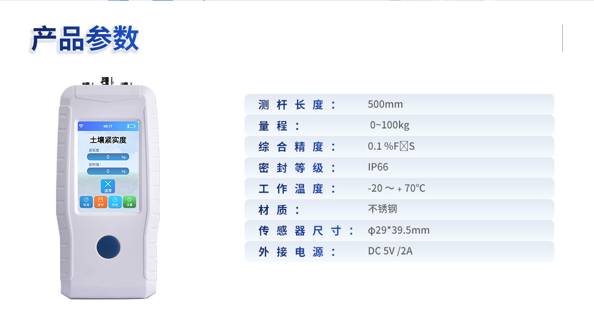 土壤紧实度由土壤抗剪力、压缩力和摩擦力等构成。是土壤强度的一个合成指标。金属柱塞或探针压入土壤时分动载和静载两种方法,不同方法的测定值不同,但有联系。柱塞的形状有锥体、平头、圆球及楔子等,这些对测定值也有影响。对同一种方法的测定值,主要决定于土壤质地、容重和含水量。其中含水量的影响**。土壤紧实度可预测土壤承载量、耕性和根系伸展的阻力。土壤紧实度的大小可影响作物根系的穿孔和生长,是一个重要的土壤物理特性指标,用于评价土壤耕性。紧实的土壤可阻止水分的入渗,降低化肥的利用率,影响植物根系生长,导致作物减产。