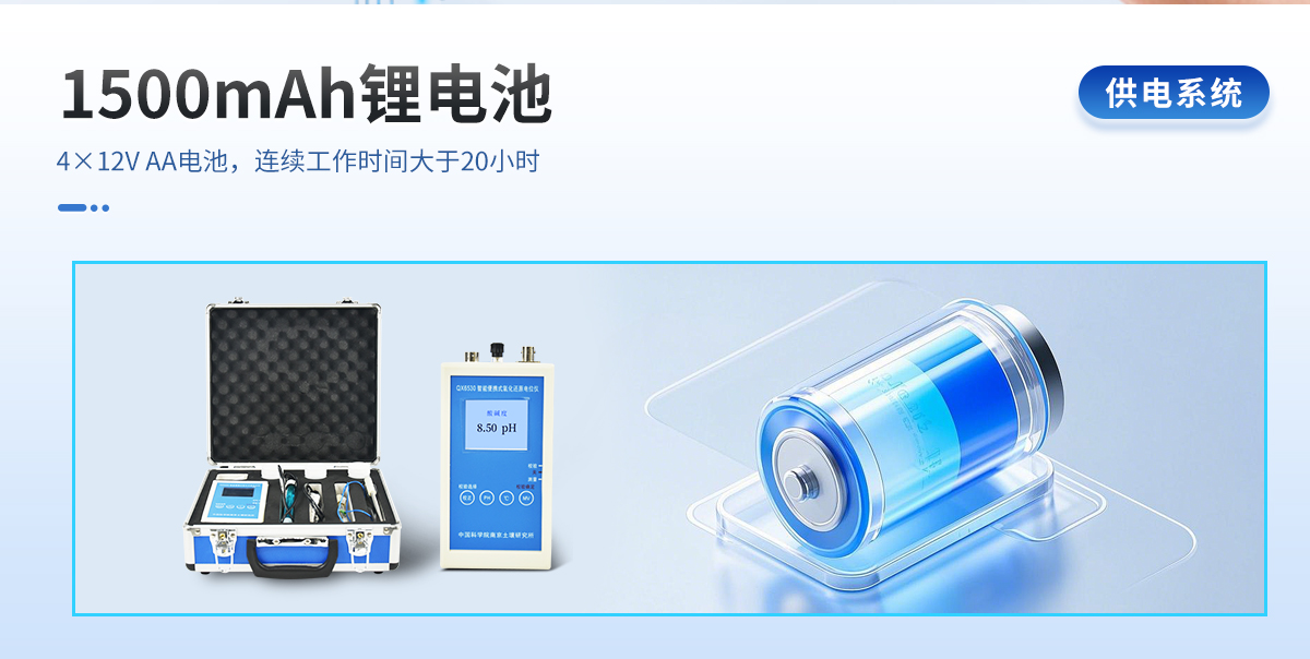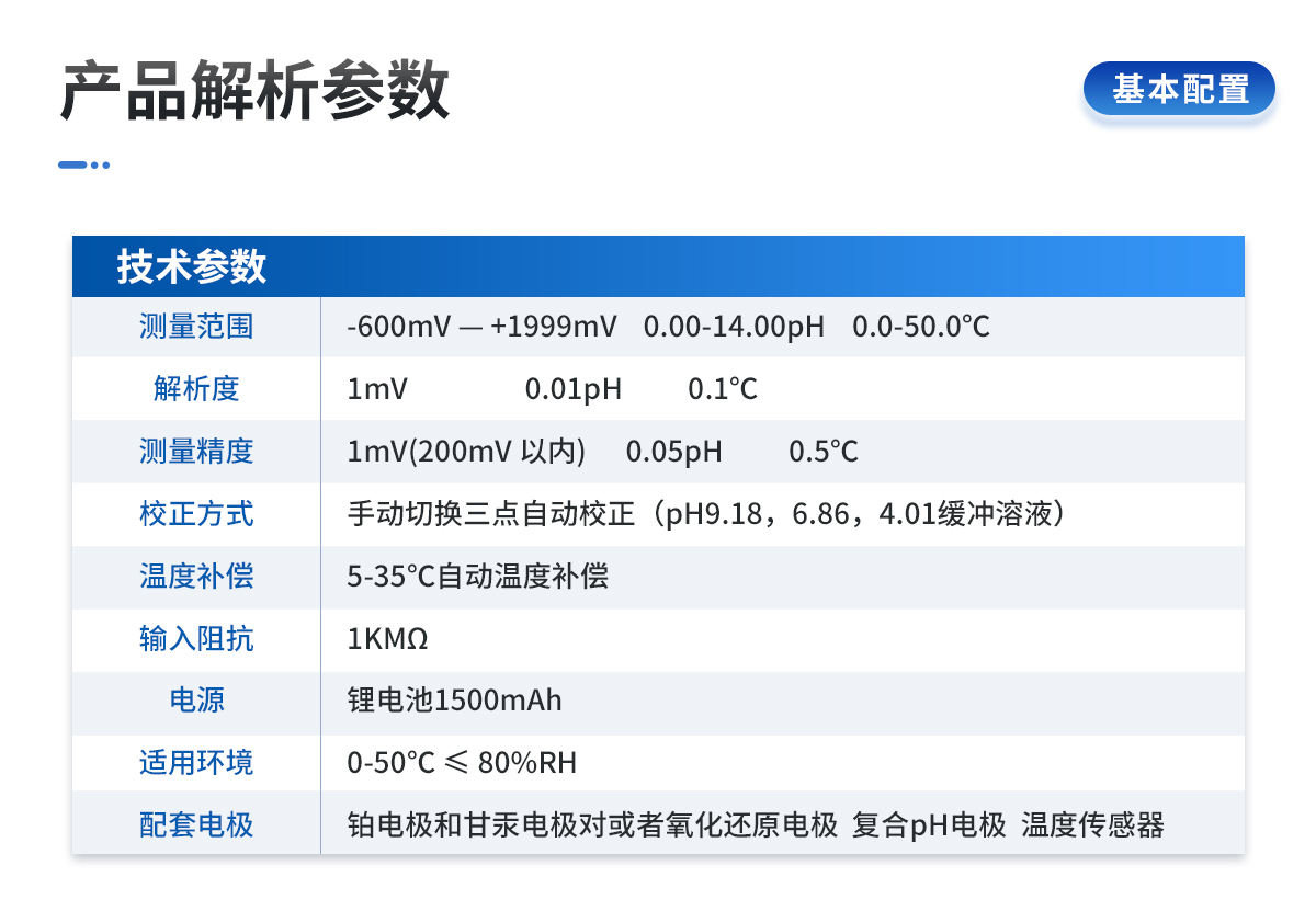 | 测量范围:-600mV — +1999mV 0.00-14.00pH 0.0-50.0℃ | 解 析 度:1mV 0.01pH 0.1℃ | 测量精度:1mV(200mV 以内) 0.05pH 0.5℃ | 校正方式:手动切换三点自动校正(pH9.18,6.86,4.01缓冲溶液) | 温度补偿:5-35℃自动温度补偿 | 输入阻抗:1KMΩ | 电 源:锂电池1500mAh | 适用环境:0-50℃ ≤ 80%RH | 配套电极:铂电极和甘汞电极对或者氧化还原电极 复合pH电极 温度传感器 | 电 源:4×12V AA电池,连续工作时间大于20小时 | 测量时间:30-45min | 仪器尺寸:200×85×40 | 重 量:500g |