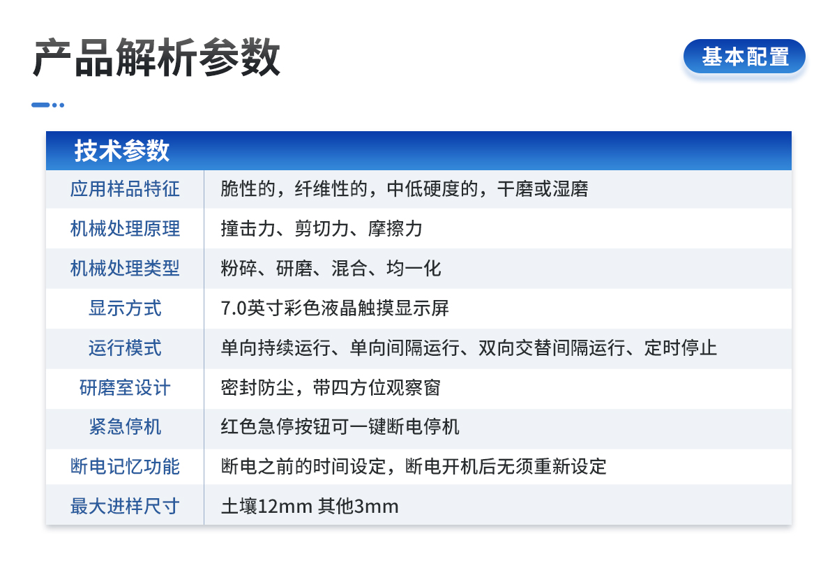 | 应用领域:土壤、地质、环保、第三方检测、农牧业、农产品质量、资源与环境等,土壤制样、重金属分析 | 应用样品特征:脆性的,纤维性的,中低硬度的,干磨或湿磨 | 仪器机械处理原理:撞击力、剪切力、摩擦力 | 仪器机械处理类型:粉碎、研磨、混合、均一化 | 控制系统:触摸屏、无线遥控 | 远程遥控:标配无线遥控器,可远距离控制研磨机的启动、停止、加速、减速以及可切换三种运行模式(单向持续运行,单向间隔运行,双向交替间隔运行) | 显示方式:7.0寸彩色液晶显示屏,可显示、触控操作运行模式、运行时间、转速、交替运行间隔 | 运行模式:单向持续运行、单向间隔运行、双向交替间隔运行、定时停止 | 连续运行时间设定:0.1~9999.9分钟 | 交替、单向间隔暂停时间设定:0.1~9999.9分钟 | 主盘转速:50-450min | 研磨罐转速:100-900min | 传动比(行星盘、研磨罐):1:2 | 可连续工作(满负荷):90h | 紧急停机:红色急停按钮可一键断电停机 | 断电记忆功能:断电之前的时间设定,断电开机后无须重新设定 | 过载保护功能:有 | 研磨室设计:密封防尘,带四方位观察窗 | 同时处理样品种数:4种 | 适用研磨罐:本机是新款通用型,100ml、250ml、500ml三种规格研磨罐均可使用,可根据客户需求同时放不同规格的罐;对角对称即可(4个研磨罐为一套)。 | **进样尺寸:土壤12mm 其他3mm | 研磨罐配球量:罐子容积的三分之一 | **装样量:研磨罐容积的三分之二 | 出样粒度:*小可达0.1um(即1.0×10mm-4) | 研磨罐材质:玛瑙、陶瓷、聚四氟乙烯、氧化锆、聚氨酯、不锈钢、尼龙、碳化钨、硬质合金等可选(常用玛瑙、氧化锆研磨罐) | 研磨球材质:玛瑙、氧化锆、不锈钢、陶瓷、硬质合金、碳化硅等 | 研磨球直径:3、5、10、15、20mm(根据实际需求配置) | 电源端口:国标、欧标、美标、英标等 | 电机转速、功率、电压:1400rpm、0.75kw、220V±10%单相,50/60Hz | 净重:80kg | 尺寸(长宽高):756*484*488mm | 噪声描述:60dB | 防护等级:IP60 | 标准配置:研磨仪主机:1台; | 研磨罐锁紧装置:1套4个; | 250ml研磨机研磨罐保护装置:1套4个; | 100ml研磨机研磨罐保护装置:1套4个; | 电源线:1根; | 说明书:1本; | 保修卡:1张; | 合格证:1张 |