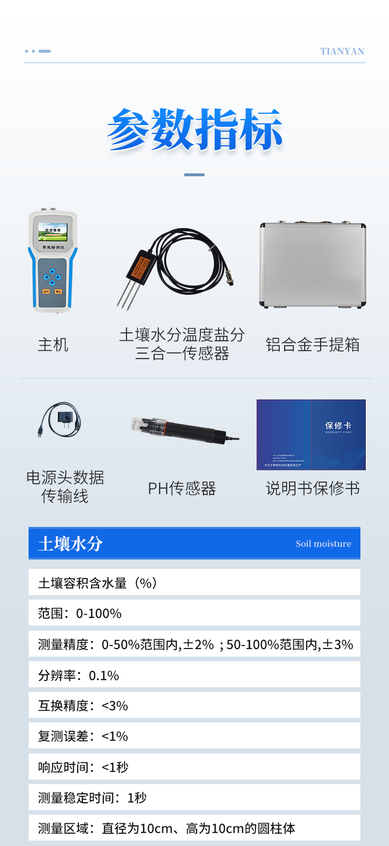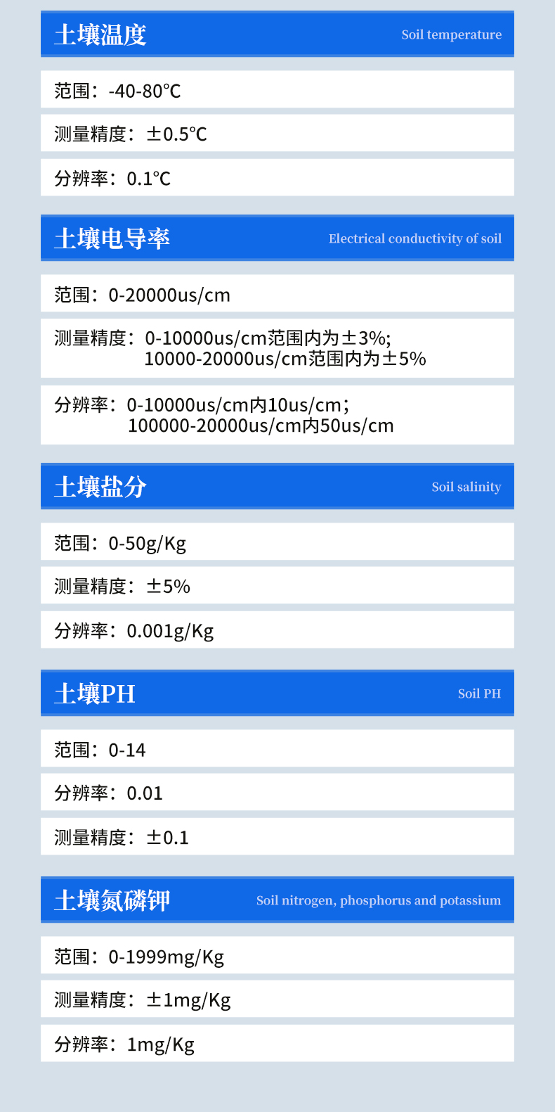 | 土壤水分:土壤容积含水量(%) 范围:0-100% 测量精度:0-50%范围内,±2% ;50-100%范围内,±3% 分辨率:0.1% 互换精度:<3%> | 土壤电导率:范围:0-20000us/cm 测量精度:0-10000us/cm范围内为±3%;10000-20000us/cm范围内为±5% 分辨率:0-10000us/cm内10us/cm;100000-20000us/cm内50us/cm | 土壤温度:范围:-40-80℃ 测量精度:±0.5℃ 分辨率:0.1℃ | 土壤盐分:范围:0-50g/Kg 测量精度:±5% 分辨率:0.001g/Kg | 土壤PH:范围:0-14 分辨率:0.01 测量精度:±0.1 | 土壤氮磷钾:范围:0-1999mg/Kg 测量精度:±1mg/Kg 分辨率:1mg/Kg 仪器尺寸:204*100*36(mm)(长*宽*高) 重量:0.3kg 软件:上位机软件免费赠送 包装尺寸:450*190*350mm 包装重量:3.6kg |