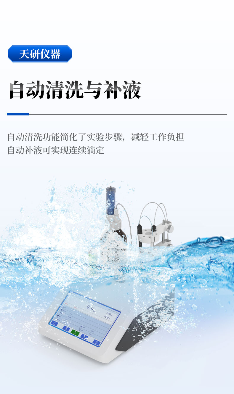 7. 自动清洗与补液:自动清洗功能简化了实验步骤,减轻工作负担;自动补液可实现连续滴定。所有管路采用自动清洗及多次润洗方式,液接部分无溶液残留并且可兼容绝大多数强酸碱及有机溶剂,有效减少样品交叉污染,确保了数据的准确可靠。