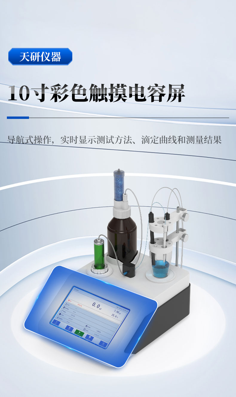 2. 10 寸彩色触摸电容屏,导航式操作,实时显示测试方法、滴定曲线和测量结果。